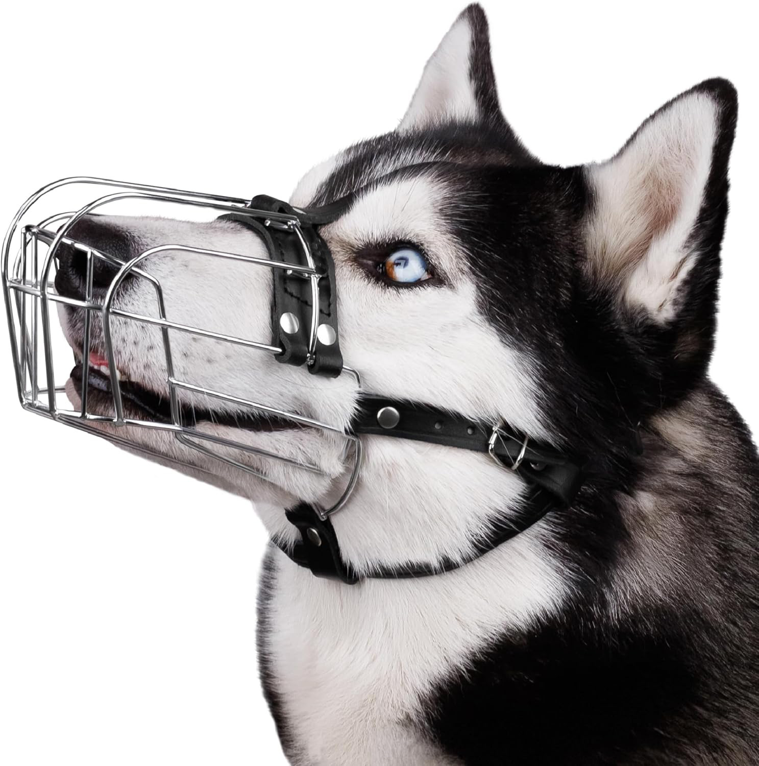 Focinheira para cães, ajustáveis, resistentes, cesta de arame de metal para cães grandes, com correias de pele, ideal para exercícios, para beber, treinar, evitar mordidas